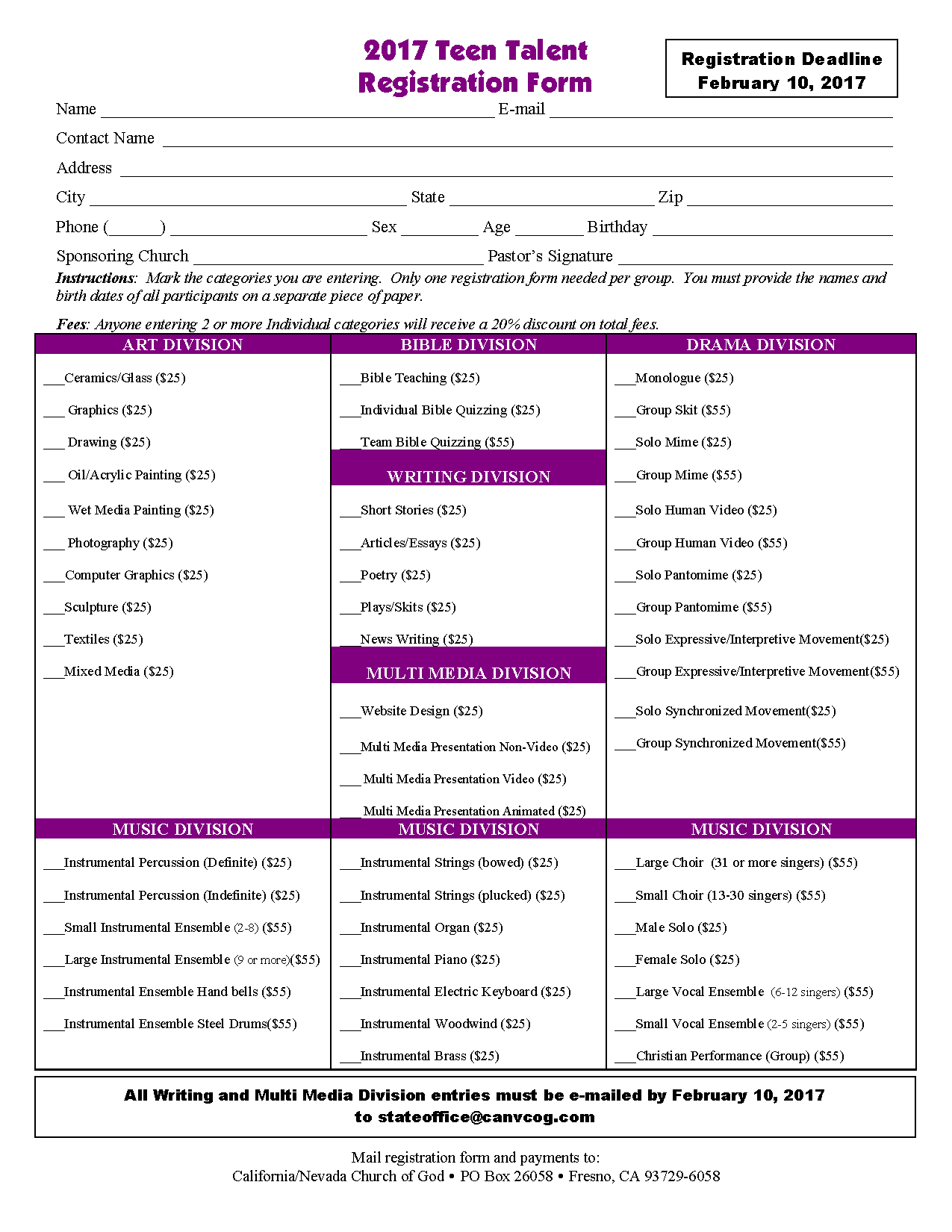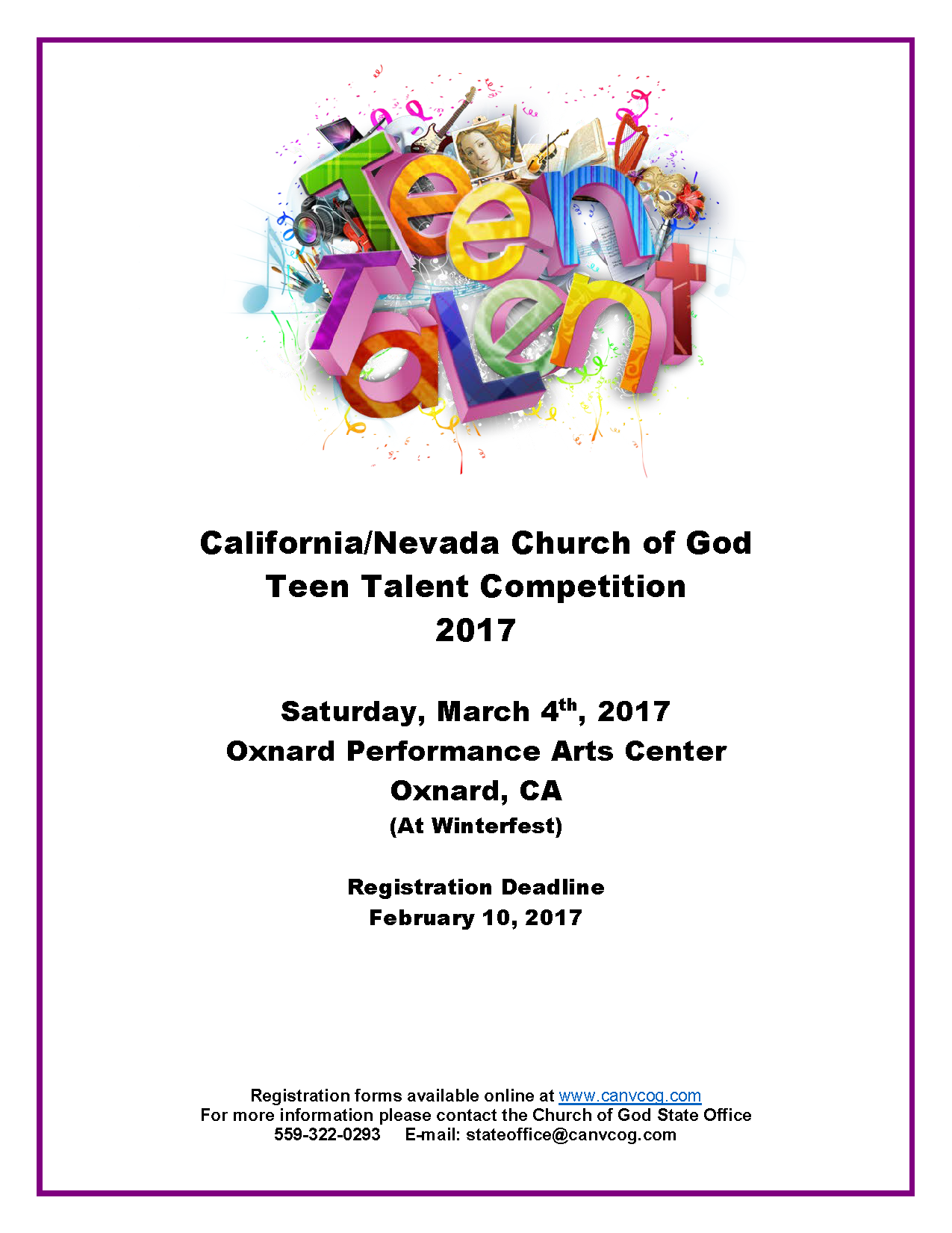 California/Nevada Church of God Teen Talent Competition 2017Saturday, March 4th, 2017 Oxnard Performance Arts Center Oxnard, CA (At Winterfest) Registration Deadline February 10, 2017 Click to download the flyer and find out more!