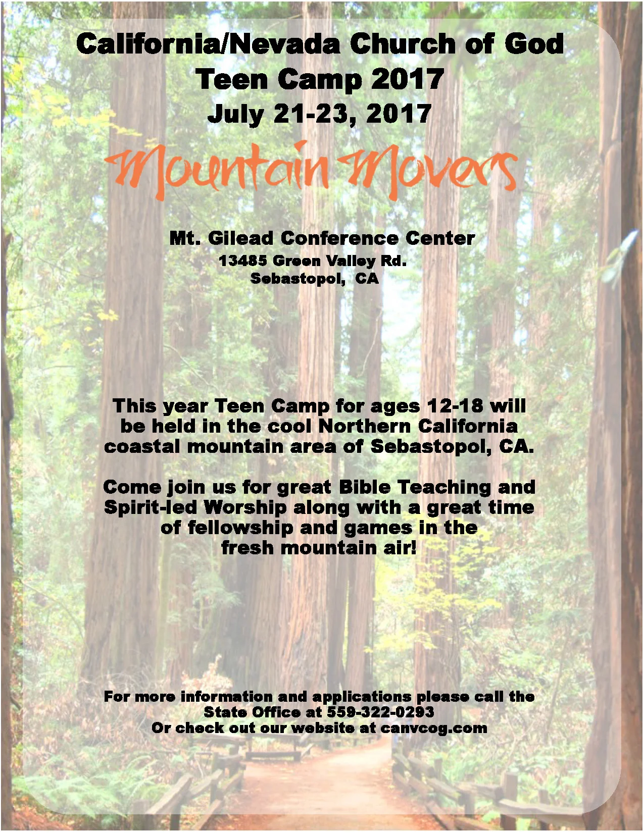 This year Teen Camp for ages 12-18 will be held in the cool Northern California coastal mountain area of Sebastopol, CA. Come join us for great Bible Teaching and Spirit-led Worship along with a great time of fellowship and games in the fresh mountain air!